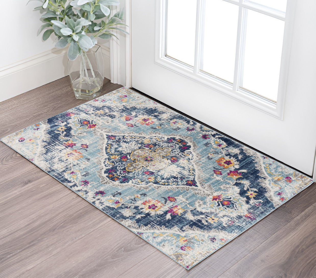 This 2' x 3' blue and beige oriental washable non skid area rug, is a great way to add warmth to a room. This rectangle shaped rug features a oriental design in blue and beige to give it visual interest. A classic shape marries with good looking design for your space This superior Turkish rug represents the highest quality and is built to last. Area Rugs help to give warmth and sense of home to your space. 1" H x 27" W x 31" D