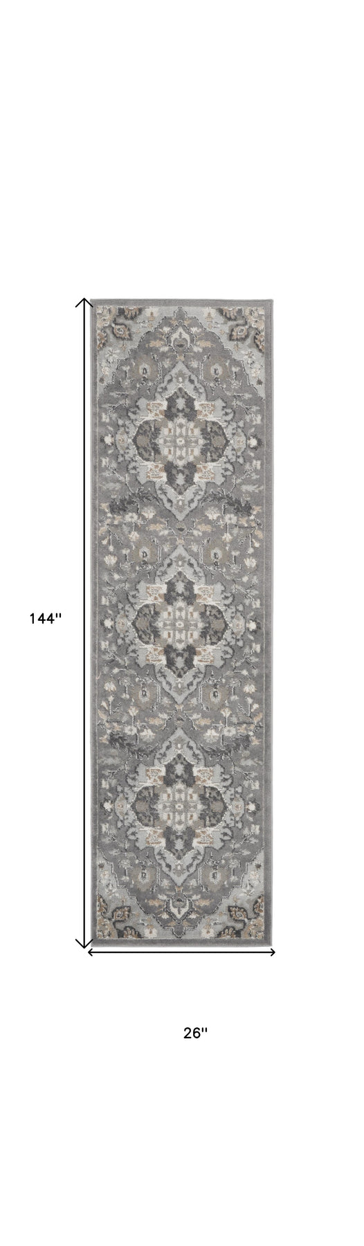 This 12-foot gray and black floral non skid runner rug, is a great way to add warmth to a room. Built to last, this rug crafted from polypropylene and polyester blend fibers is known for its durability and long lasting appeal. Rugs are a great way to showcase your style, hide imperfections, warm your home and reduce noise. This rectangular shaped rug features a abstract design that will add a functional and decorative accent to your space. This transitional styled runners makes a great accent for the hallway, in front of cabinets, in the laundry room, or any other space you need a narrow and long rug. 26-inch h x 144-inch w x 0.25-inch d