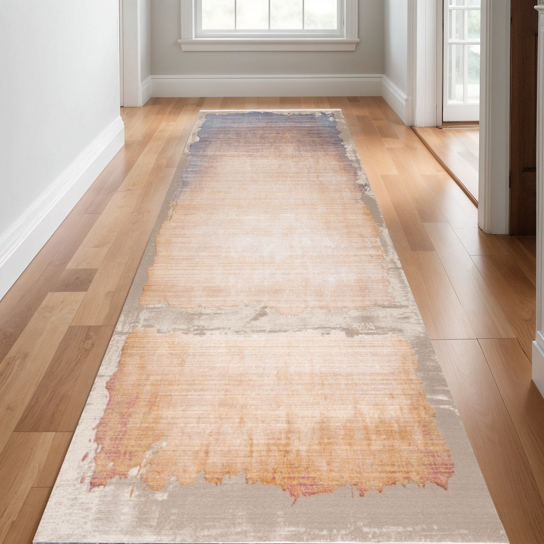 This 11-foot beige blue and brown abstract runner rug, is a great way to add warmth to a room. Ideal for spaces with kids and pets, this rug is stain resistant to help repel dirt and spilled liquids. Built to last, this rug crafted from polyester and cotton fibers is known for its durability and long lasting appeal. Rugs are a great way to showcase your style, hide imperfections, warm your home and reduce noise. This abstract style runner makes a great accent for the hallway, in front of cabinets, in the laundry room, or any other space you need a narrow and long rug. 27-inch h x 132-inch w x 0.6-inch d.