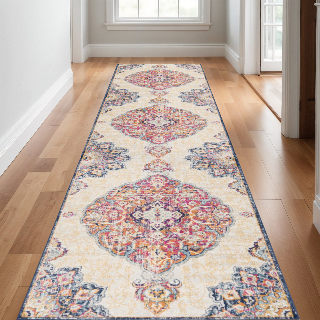Add some artistry to your room with this 11-foot blue pink and beige oriental runner rug. Ideal for spaces with kids and pets, this rug is stain resistant to help repel dirt and spilled liquids. Built to last, this rug crafted from polypropylene fibers is known for its durability and long lasting appeal. Rugs are a great way to showcase your style, hide imperfections, warm your home and reduce noise. This southwest style runner makes a great accent for the hallway, in front of cabinets, in the laundry room, or any other space you need a narrow and long rug. 27-inch h x 132-inch w x 0.4-inch d.