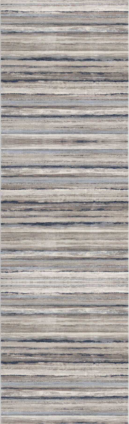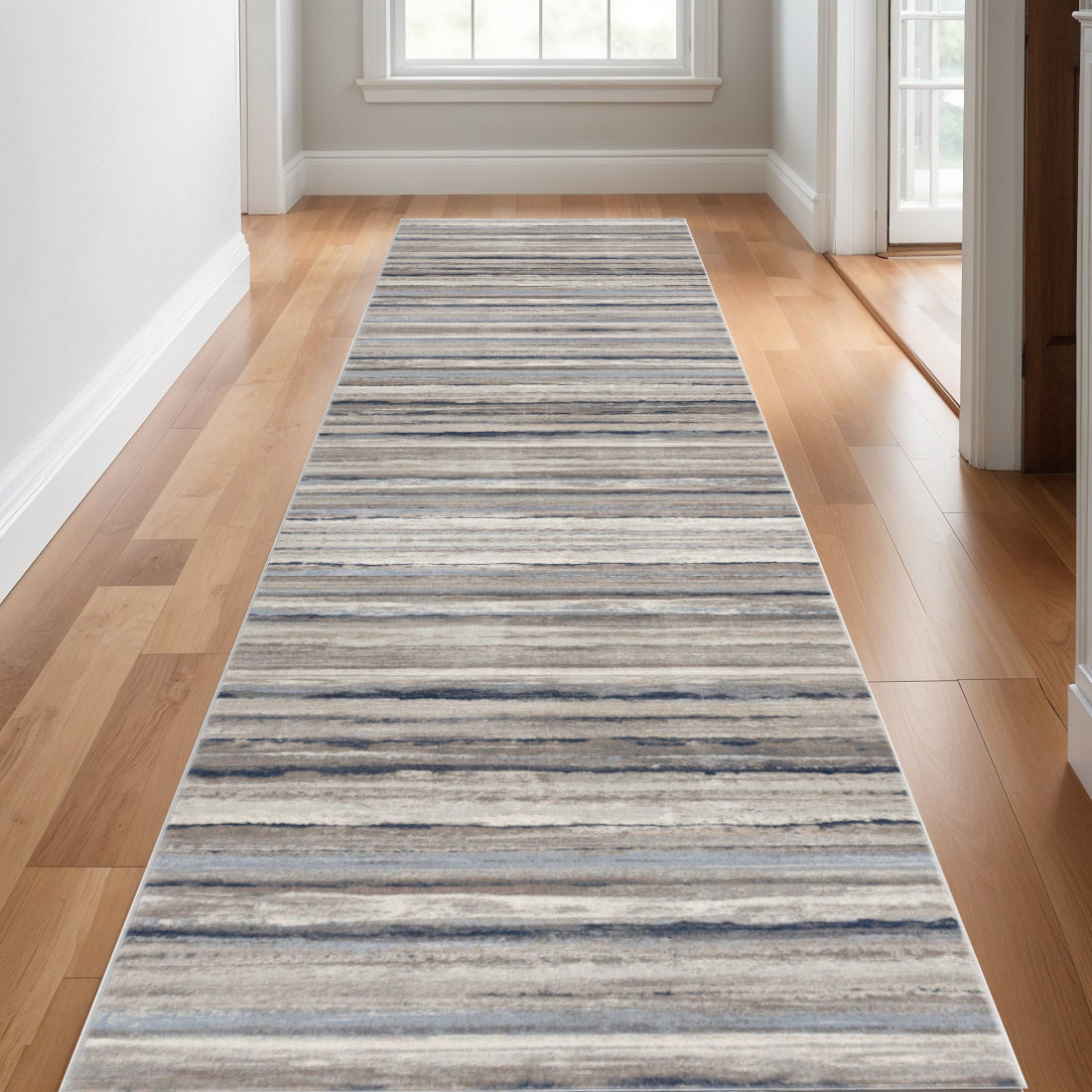 Set an inviting tone in your space with this 11-foot blue brown and beige striped runner rug. Ideal for spaces with kids and pets, this rug is stain resistant to help repel dirt and spilled liquids. Built to last, this rug crafted from polypropylene fibers is known for its durability and long lasting appeal. Rugs are a great way to showcase your style, hide imperfections, warm your home and reduce noise. This scandinavian style runner makes a great accent for the hallway, in front of cabinets, in the laundry room, or any other space you need a narrow and long rug. 27-inch h x 132-inch w x 0.4-inch d.