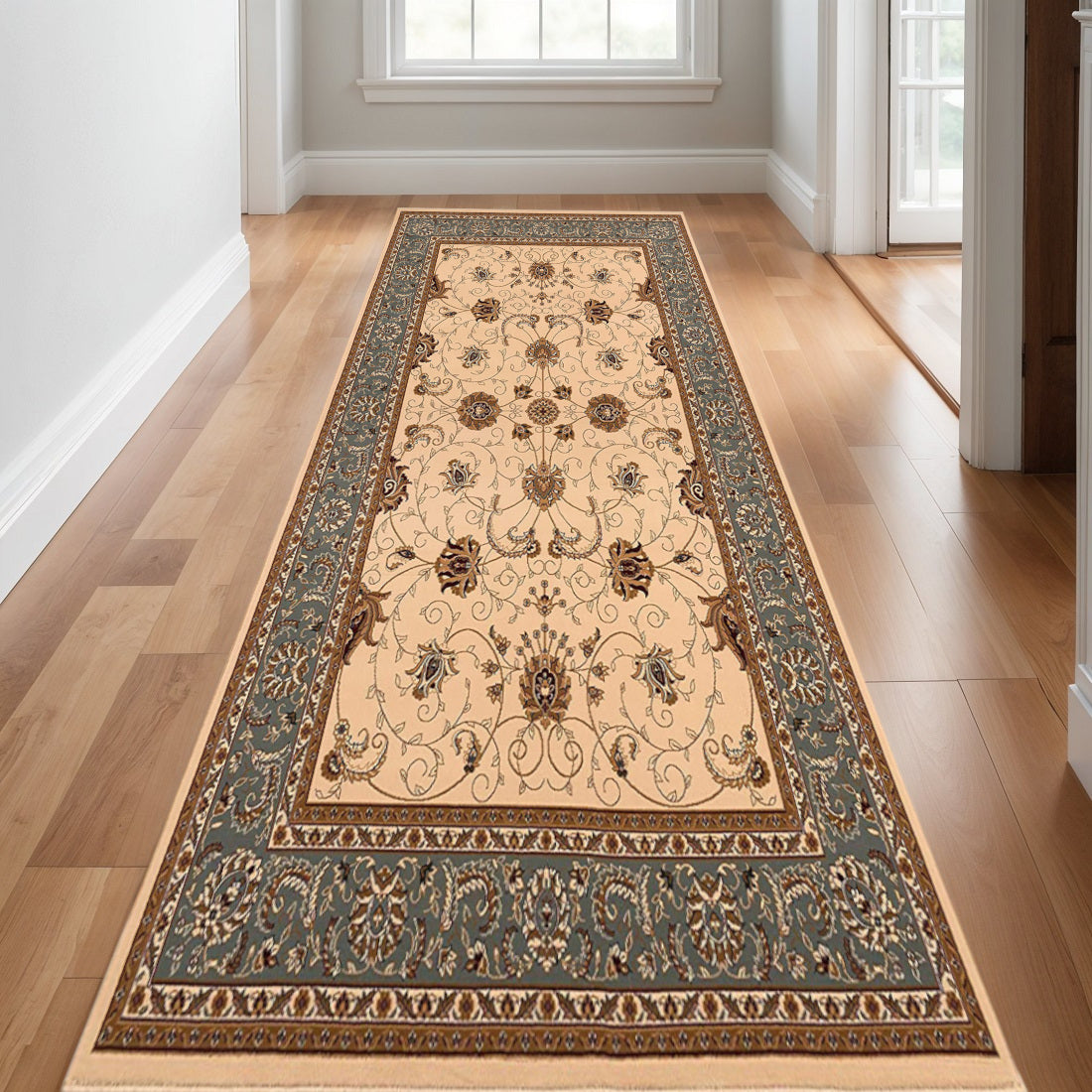 Set an inviting tone in your space with this 11-foot beige gray and brown oriental runner rug. Ideal for spaces with kids and pets, this rug is stain resistant to help repel dirt and spilled liquids. Built to last, this rug crafted from polypropylene fibers is known for its durability and long lasting appeal. Rugs are a great way to showcase your style, hide imperfections, warm your home and reduce noise. This traditional style runner makes a great accent for the hallway, in front of cabinets, in the laundry room, or any other space you need a narrow and long rug. 27-inch h x 132-inch w x 0.35-inch d.