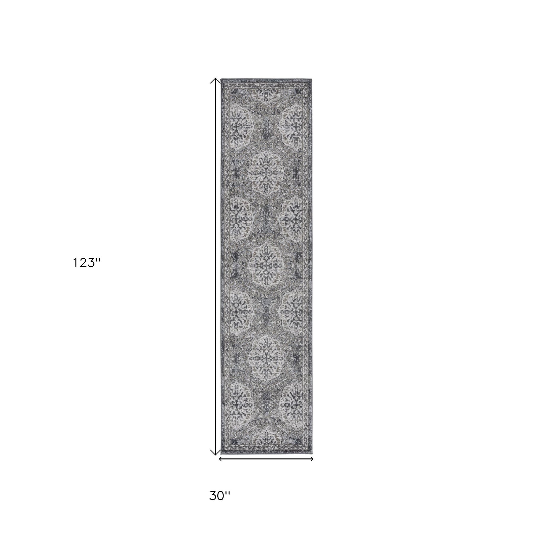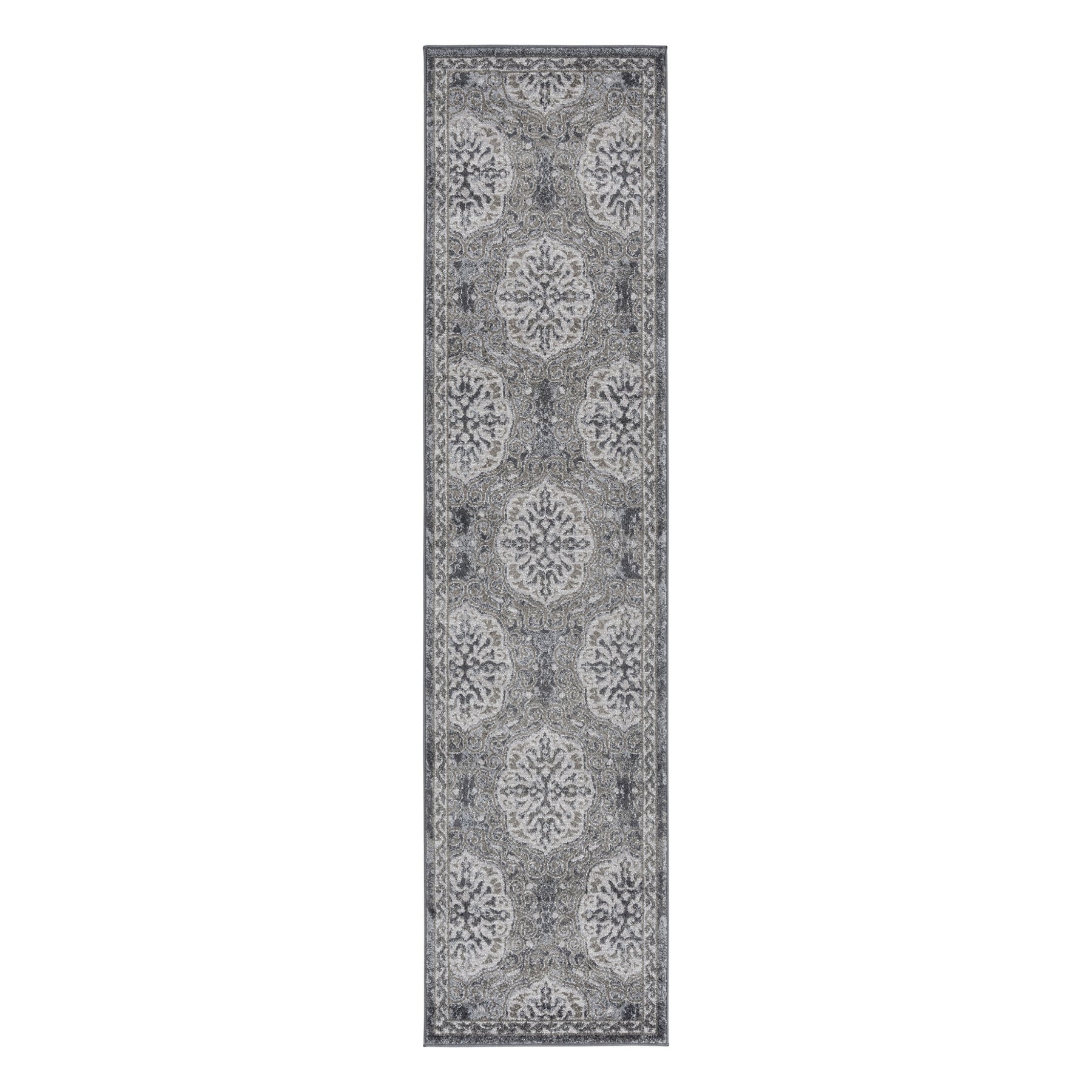 Add great coloration and comfortable texture to your space with this 10-foot charcoal and gray medallion power loom runner rug. This runner shaped rug features a medallion design in charcoal and gray to give it visual interest. A classic shape marries with good looking design for your space ideal for spaces with kids and pets, this rug is stain resistant to help repel stains and spilled liquids. Area rugs help to give warmth and sense of home to your space. 30-inch H x 123-inch W x 0.38-inch D