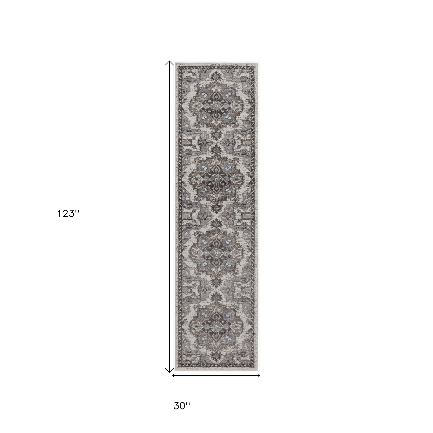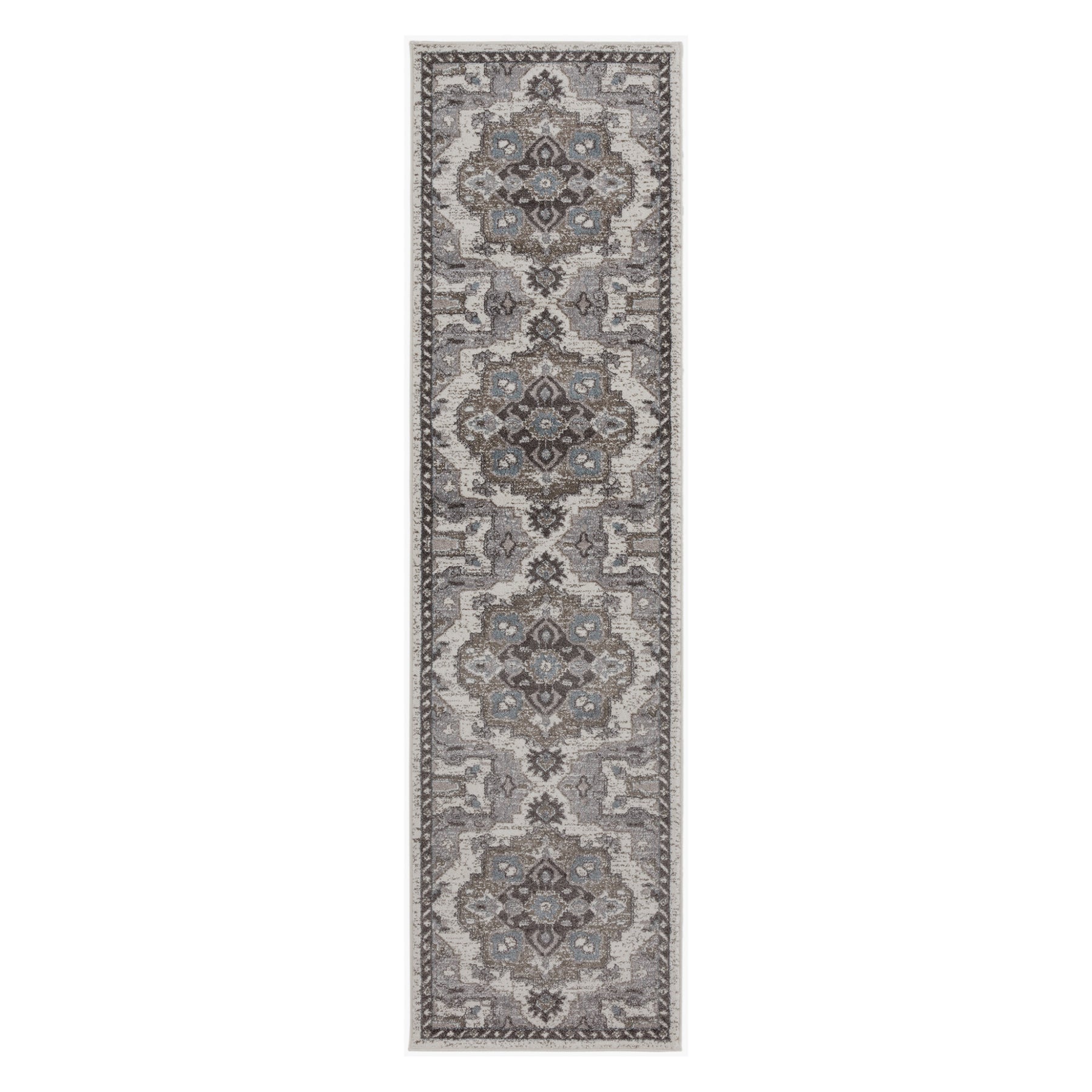 Set an inviting tone in your space with this 10-foot ivory taupe and gray medallion power loom runner rug. This runner shaped rug features a medallion design in ivory taupe and gray to give it visual interest. A classic shape marries with good looking design for your space ideal for spaces with kids and pets, this rug is stain resistant to help repel stains and spilled liquids. Area rugs help to give warmth and sense of home to your space. 30-inch H x 123-inch W x 0.38-inch D