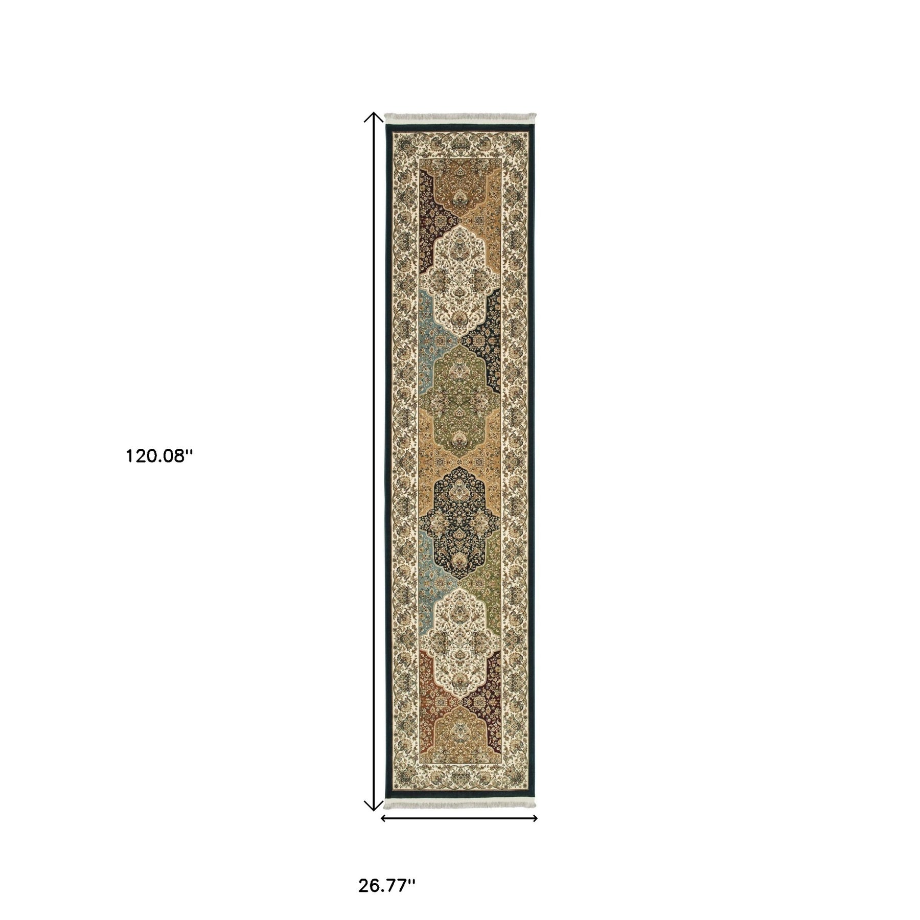 Add great coloration and comfortable texture to your space with this 10-foot navy blue oriental power loom runner rug with fringe. This runner shaped rug features a oriental design in navy blue to give it visual interest. A classic shape marries with good looking design for your space ideal for spaces with kids and pets, this rug is stain resistant to help repel stains and spilled liquids. Tassel ends bring a timeless and fashionable look to your interior. Place this area rug against a hardwood or tile floor and it will enliven your living space with style and sophistication. 26.77-inch H x 120.08-inch W x 0.16-inch D