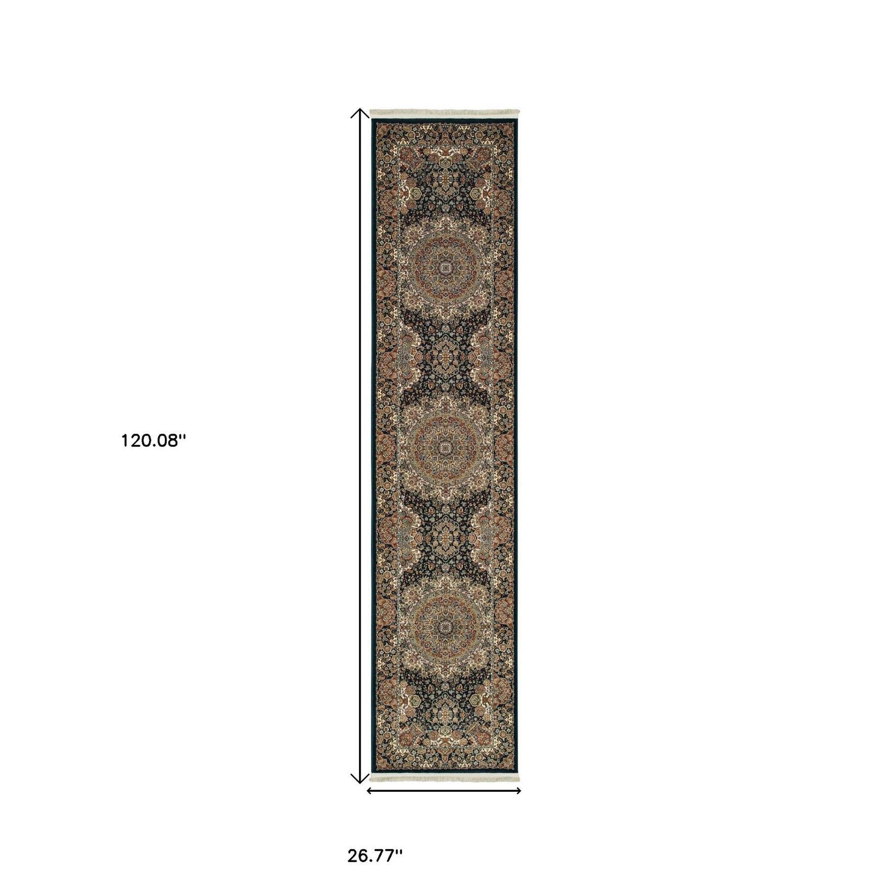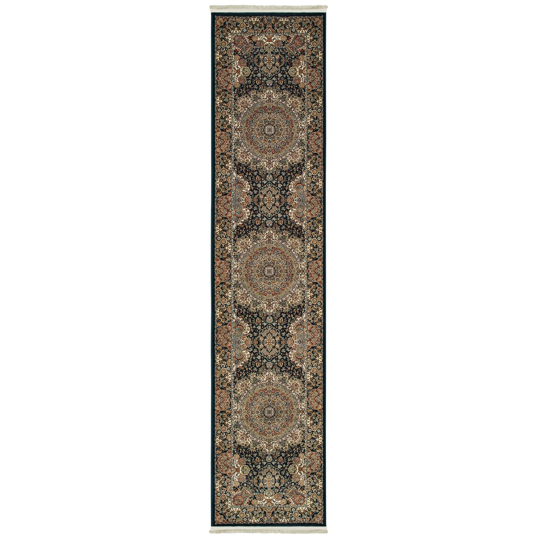 Add some artistry to your room with this 10-foot dark blue medallion power loom runner rug with fringe. This runner shaped rug features a medallion design in dark blue to give it visual interest. A classic shape marries with good looking design for your space ideal for spaces with kids and pets, this rug is stain resistant to help repel stains and spilled liquids. Tassel ends bring a timeless and fashionable look to your interior. Area rugs help to give warmth and sense of home to your space. 26.77-inch H x 120.08-inch W x 0.16-inch D