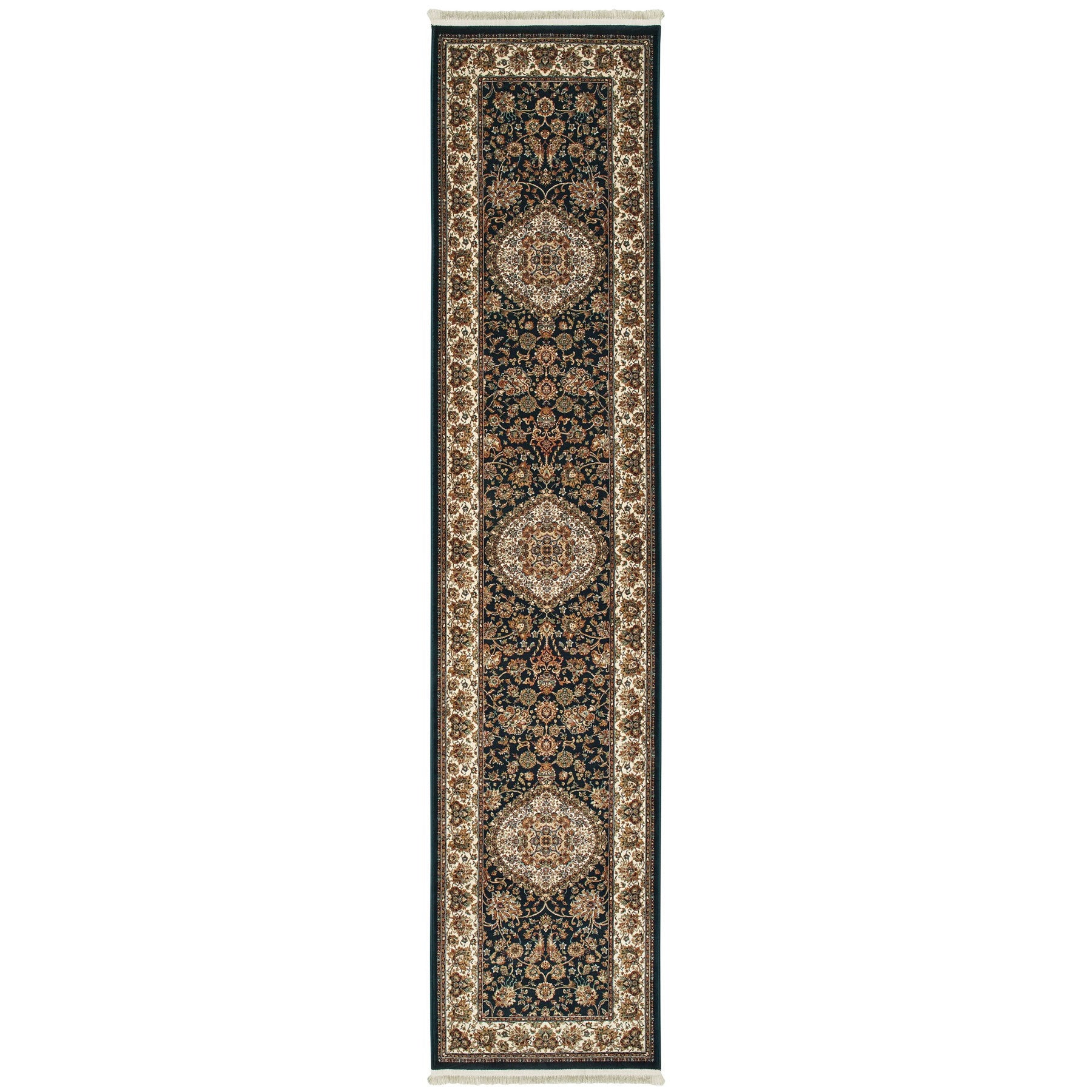 Add some artistry to your room with this 10-foot dark blue medallion power loom runner rug with fringe. This runner shaped rug features a medallion design in dark blue to give it visual interest. A classic shape marries with good looking design for your space ideal for spaces with kids and pets, this rug is stain resistant to help repel stains and spilled liquids. Tassel ends bring a timeless and fashionable look to your interior. Place this area rug against a hardwood or tile floor and it will enliven your living space with style and sophistication. 26.77-inch H x 120.08-inch W x 0.16-inch D