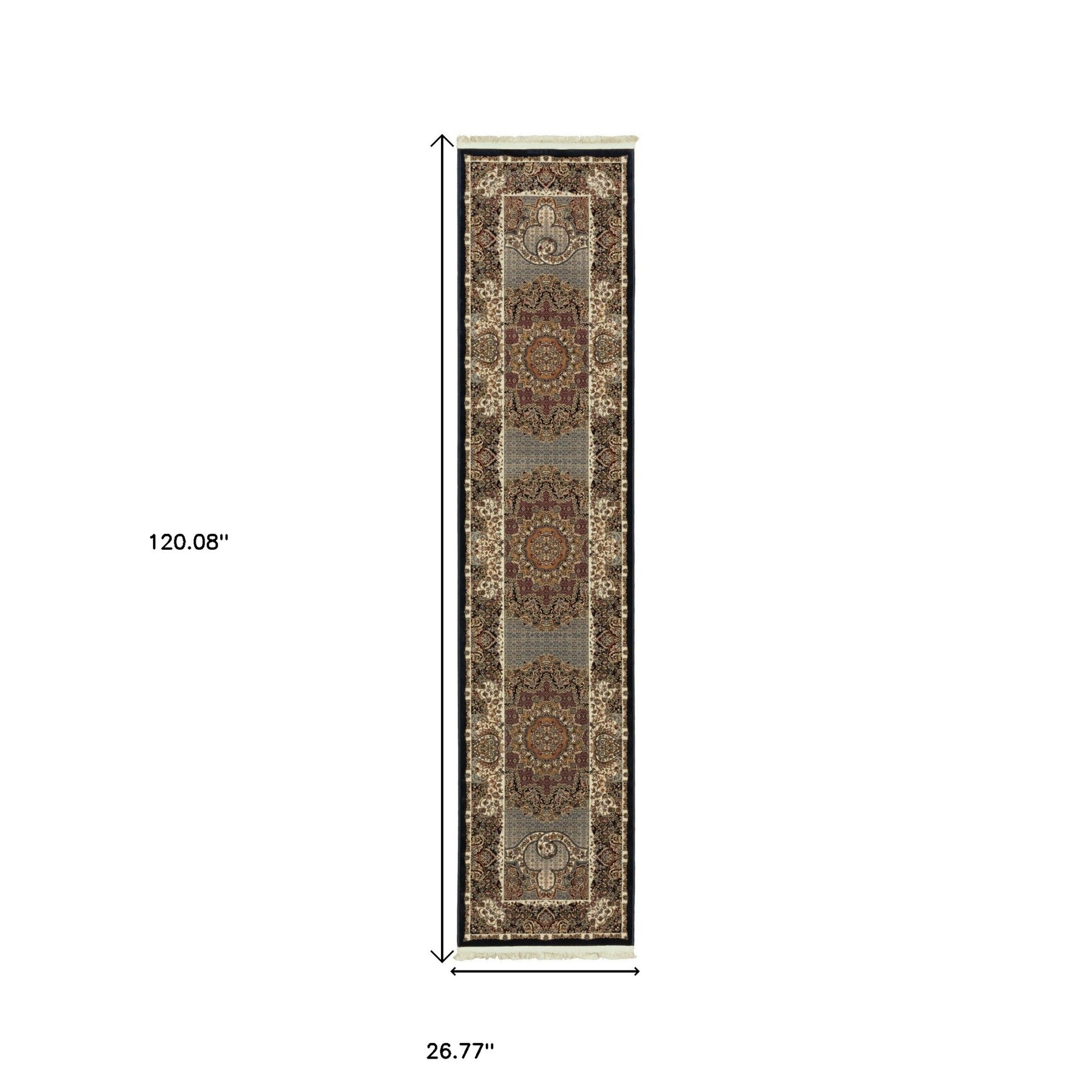 This 10-foot blue medallion power loom runner rug with fringe, is a great way to add warmth to a room. This runner shaped rug features a medallion design in blue to give it visual interest. A classic shape marries with good looking design for your space ideal for spaces with kids and pets, this rug is stain resistant to help repel stains and spilled liquids. Tassel ends bring a timeless and fashionable look to your interior. Area rugs help to give warmth and sense of home to your space. 26.77-inch H x 120.08-inch W x 0.16-inch D