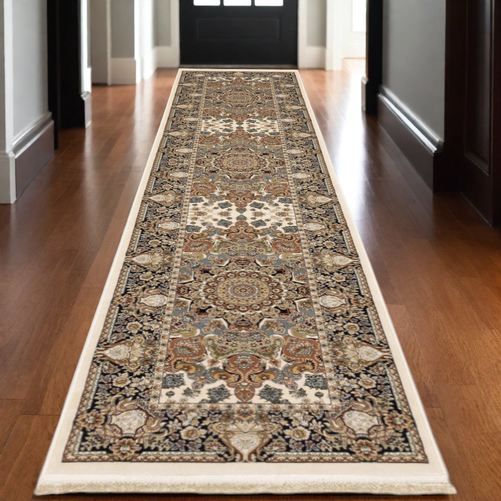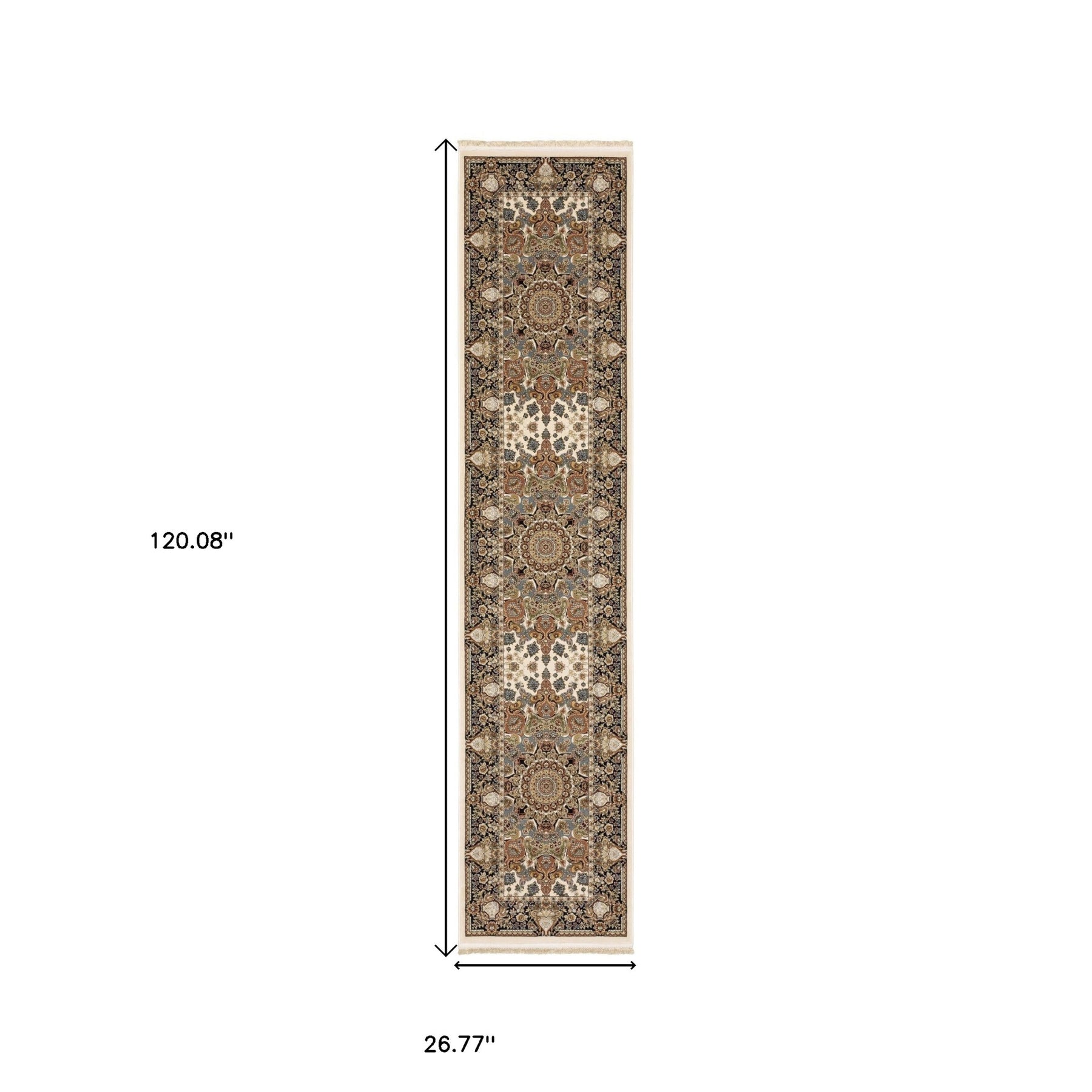 Set an inviting tone in your space with this 10-foot ivory medallion power loom runner rug with fringe. This runner shaped rug features a medallion design in ivory to give it visual interest. A classic shape marries with good looking design for your space the coloring of this rug adds a delightfully neutral tone to your home and will easily match with most any decor. Ideal for spaces with kids and pets, this rug is stain resistant to help repel stains and spilled liquids. Tassel ends bring a timeless and fashionable look to your interior. Area rugs help to give warmth and sense of home to your space. 26.77-inch H x 120.08-inch W x 0.16-inch D