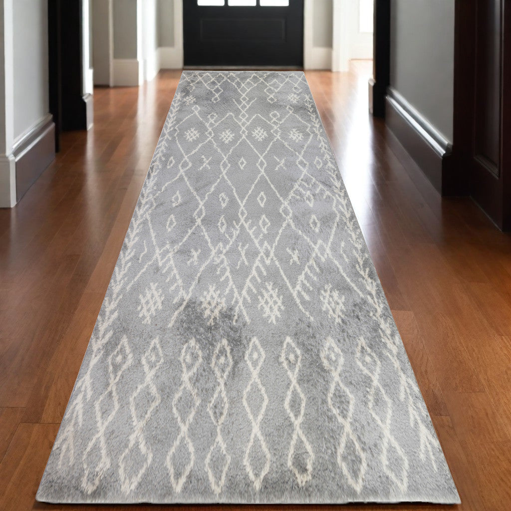Set an inviting tone in your space with this 10-foot ivory and light gray geometric shag runner rug. Ideal for spaces with kids and pets, this rug is stain resistant to help repel dirt and spilled liquids. Built to last, this rug crafted from polypropylene fibers is known for its durability and long lasting appeal. Rugs are a great way to showcase your style, hide imperfections, warm your home and reduce noise. This rectangular shaped rug features a abstract design that will add a functional and decorative accent to your space. The retro shag construction of this luxurious rug will provide a soft and comfortable barrier to color tile and hardwood floors. This contemporary style runner makes a great accent for the hallway, in front of cabinets, in the laundry room, or any other space you need a narrow and long rug. 26-inch h x 120-inch w x 1.8-inch d.