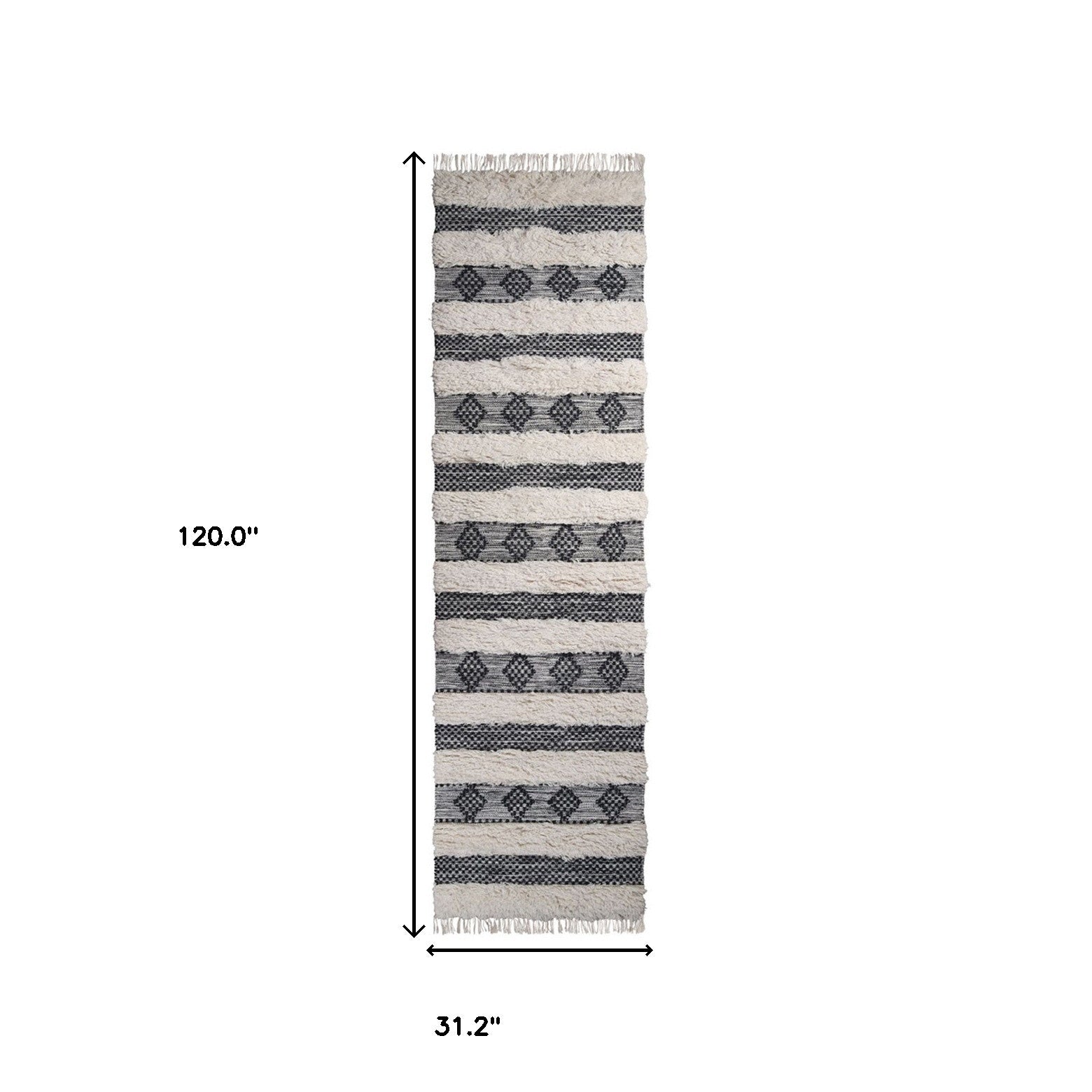 This 10' black and ivory wool striped flatweave handmade stain resistant runner rug with fringe, is a great way to add warmth to a room. This runner shaped rug features a striped design in black and ivory to give it visual interest. A classic shape marries with good looking design for your space Made in Turkey, this rug offers high quality combined with good looking designer sensibilities. Ideal for spaces with kids and pets, this rug is stain resistant to help repel stains and spilled liquids. Tassel ends bring a timeless and fashionable look to your interior. Area Rugs help to give warmth and sense of home to your space. 1.38" H x 31.2" W x 120" D