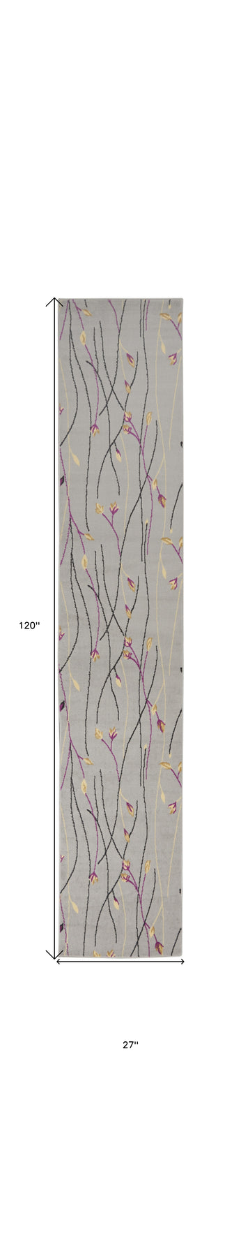 This 10-foot gray floral vines runner rug, is a great way to add warmth to a room. Built to last, this rug crafted from polypropylene fibers is known for its durability and long lasting appeal. Rugs are a great way to showcase your style, hide imperfections, warm your home and reduce noise. This rectangular shaped rug features a abstract design that will add a functional and decorative accent to your space. This contemporary style runner makes a great accent for the hallway, in front of cabinets, in the laundry room, or any other space you need a narrow and long rug. 27-inch h x 120-inch w x 0.5-inch d.