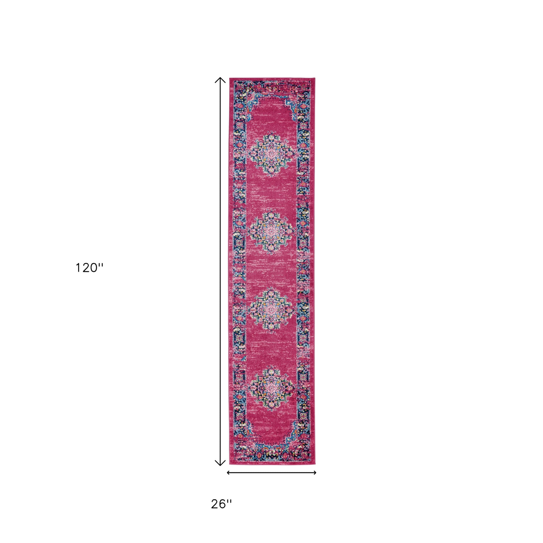 Set an inviting tone in your space with this 10-foot fuchsia and blue oriental distressed runner rug. Built to last, this rug crafted from polypropylene fibers is known for its durability and long lasting appeal. Rugs are a great way to showcase your style, hide imperfections, warm your home and reduce noise. This rectangular shaped rug features a abstract design that will add a functional and decorative accent to your space. This transitional style runner makes a great accent for the hallway, in front of cabinets, in the laundry room, or any other space you need a narrow and long rug. 26-inch h x 120-inch w x 0.5-inch d.