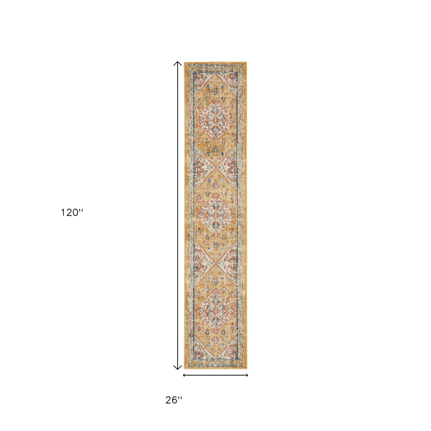 Add some artistry to your room with this 10-foot yellow and ivory medallion runner rug. Built to last, this rug crafted from polypropylene fibers is known for its durability and long lasting appeal. Rugs are a great way to showcase your style, hide imperfections, warm your home and reduce noise. This rectangular shaped rug features a abstract design that will add a functional and decorative accent to your space. This transitional style runner makes a great accent for the hallway, in front of cabinets, in the laundry room, or any other space you need a narrow and long rug. 26-inch h x 120-inch w x 0.5-inch d.