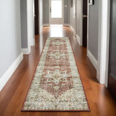 Home Outfitters 4' X 5' Ivory Red And Orange Medallion Area Rug With Fringe