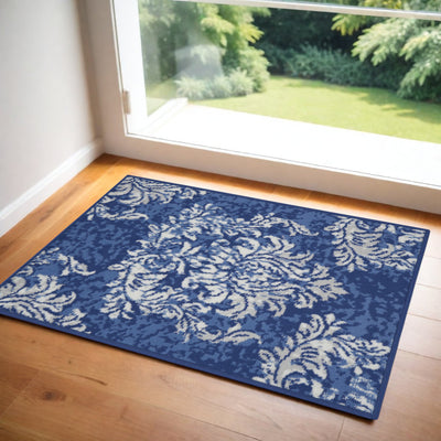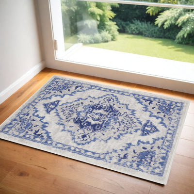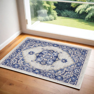 Home Outfitters 2' X 3' Ivory Blue and Gold Floral Power Loom Worn Faded Area Rug With Fringe