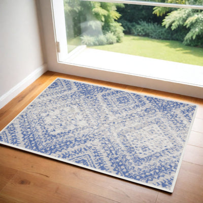 Home Outfitters 2' X 3' Ivory Taupe and Blue Ikat Power Loom Worn Faded Area Rug With Fringe