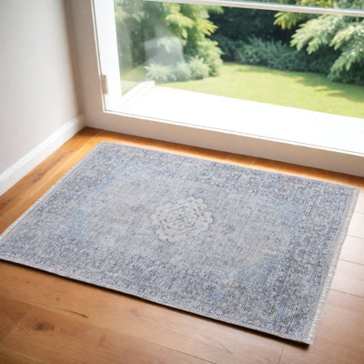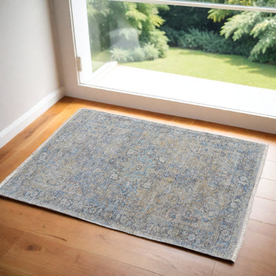 Home Outfitters 2' X 3' Ivory Gray and Blue Abstract Hand Knotted Worn Faded Area Rug