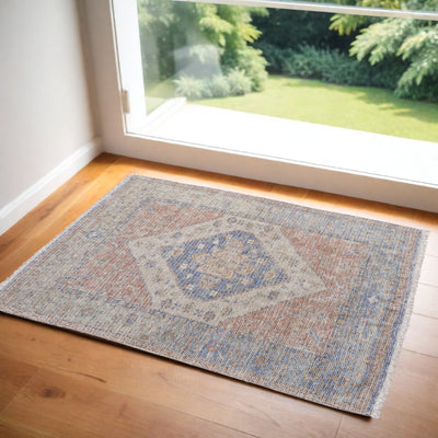 Home Outfitters 2' X 3' Blue Red and Yellow Wool Oriental Hand Knotted Area Rug