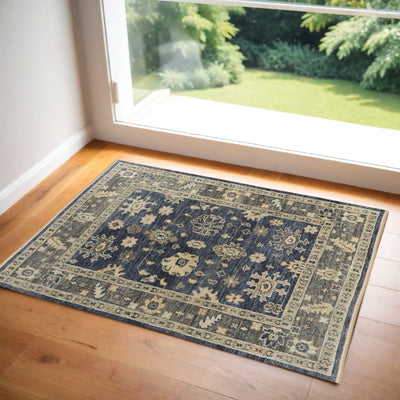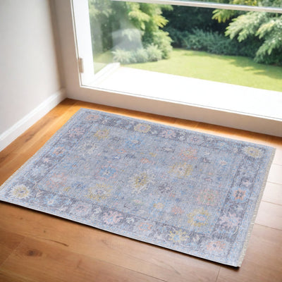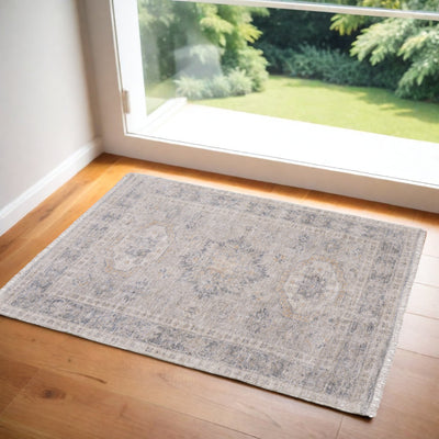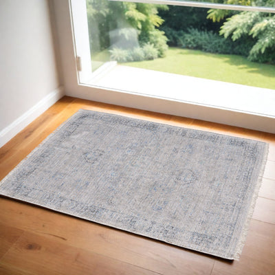 Home Outfitters 2' X 3' Ivory Gray and Blue Wool Hand Knotted Area Rug With Fringe