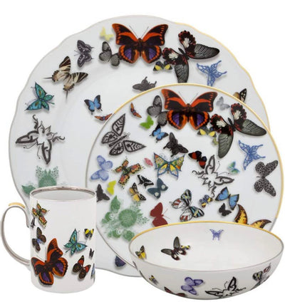 A parade of real and imaginary butterflies flying over the pieces, with notable three-dimensional effects. One of the four decorations of the Vista Alegre Christian Lacroix collection that represents the ""mix and match"" of the Christian Lacroix brand, allowing the sophisticated mixing of styles and shapes. Dinner set and decorative pieces with handmade details in gold and platinum. Lush and rich, the Butterfly Parade allows you to ""mix and match"" with the three remaining Vista Alegre Christian Lacroix decorations: Forum, Sol y Sombra and Picassiette. A collection that is luxurious and bold, fun and exquisite, blending the iconic elements of both brands.