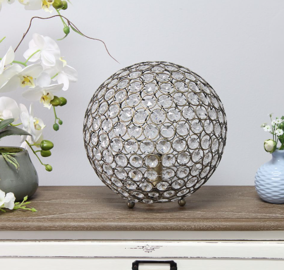 This 10" sphere shaped table lamp is a designers dream with its gorgeous shimmering crystals surrounding the rounded metal frame. Available in a number of finish options ranging from a classic gold, to a modern chrome. With the turn of a gear (rotary) switch on the cord of the lamp, a rich glow shines through the crystals, leaving your space breathtakingly illuminated.