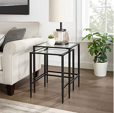 - Product Dimension 24" D x 18.5" W x 22.5" H; Transitional design; Frame is constructed of sturdy steel; Tempered glass top; Matte black finish; Smaller table tucks neatly under large table; Tapered legs; Can be used in a living room, entryway, or bedroom; Large Table Dimensions - 22.5" H x 18.5" W x 16" D; Small Table Dimensions - 20.5" H x 16" W x 16" D; Pairs well with farmhouse, traditional, and mid-century modern d?cor; Assembly Required Y; Anti-Tip Hardware - N