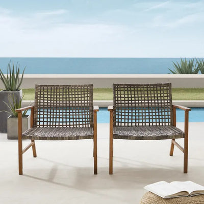Stay cool and comfortable with the Ridley 2pc Armchair Set. Featuring all-weather resin wicker, the cushionless seats have an open, breathable weave, ideal for relaxing in the summer heat. The chairs’ steel frames are hand-painted to look like real teak, offering a natural look with better durability than traditional wood furniture. The Ridley Armchairs' mixed materials and classic design make them a showstopping addition to your patio.