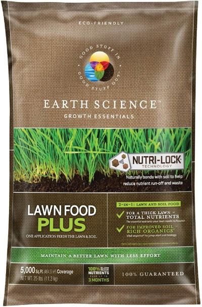 Earth Science's innovative Lawn Food Plus contains natural and organic soil improvers to provide a full lawn care solution. Contains the essential nutrients your grass needs. One application feeds the lawn and soil to help you maintain a thicker, greener lawn with less effort. Slow release nutrients feed up to 3 months. Contains Earth Science's patented Nutri-Bond Technology, which naturally bonds with soil to help reduce nutrient run-off and waste. It is the result of years of research into methods of reducing fertilizer run-off and waste. Nutri-bond naturally bonds with the soil to help keep more product where you put it. That's better for the environment and helps your lawn get the most out of every application.
