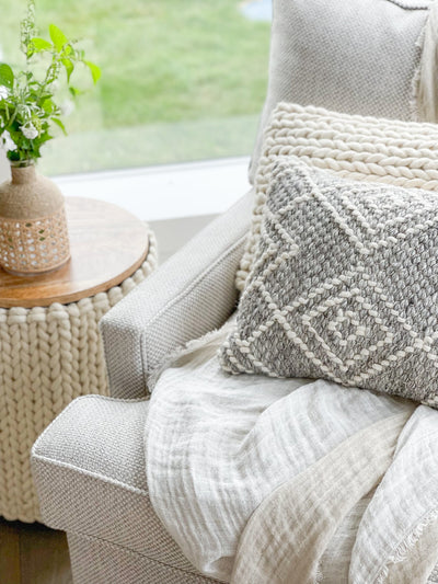 The Handwoven Braided White Pillow features a versatile white braided pattern that can be styled with any piece in the collection.