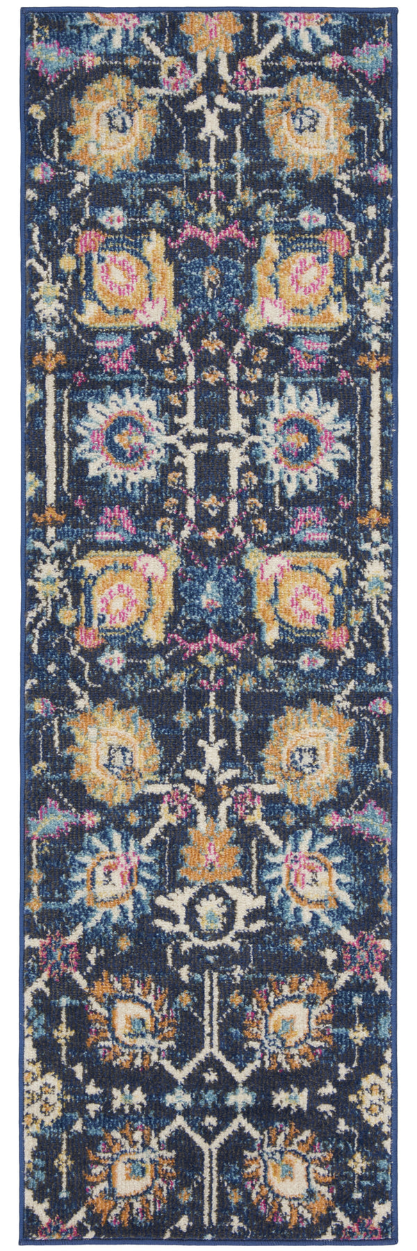 Add great coloration and comfortable texture to your space with this 6' navy blue floral power loom runner rug. This runner shaped rug features a floral design in navy blue to give it visual interest. A classic shape marries with good looking design for your space This superior Turkish rug represents the highest quality and is built to last. Place this area rug against a hardwood or tile floor and it will enliven your living space with style and sophistication. .50" H x 22.00" W x 72.00" D