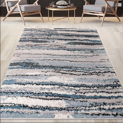 ‚ Abstract woven area rug made in Turkey‚ Featuring watercolor abstract stripe design in shades of blue‚ Machine woven plush rug ‚ Super soft high pile rug well suited to high traffic areas ‚ Easy to clean; use brushless vacuum or spot clean ‚ Transparent sprayed latex reverse; rug pad is still highly recommended to keep rug in place.‚ Stain and fade resistant‚ Oeko-Tex Certified, includes no harmful substances or chemicals‚ Rug available in multiple sizes; perfect for living room, family room, or other room decor