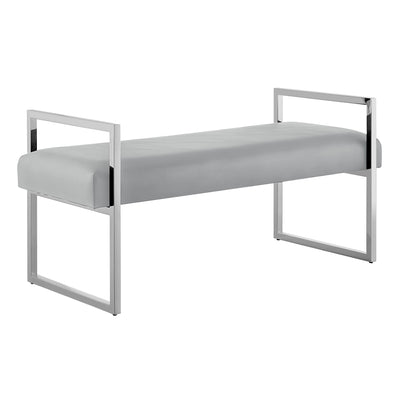Add a good looking decorative accent to your space that is also practical for seating. A silver steel frame is finished off with a gray upholstery seat that is the epitomy of quality construction and design. Expertly upholstered with padding in a soft solid color faux leather, this bench is as comfortable as it is good looking. Arms anchor this bench on either side for your comfort stability. Adding this bench to the end of your bed is a great idea to help you get ready in the morning. Easy to blend into most any room, a bench is a way to add a good looking accent to your space that can also be practical and useful. . 23-inch H x 20.5-inch W x 48-inch D