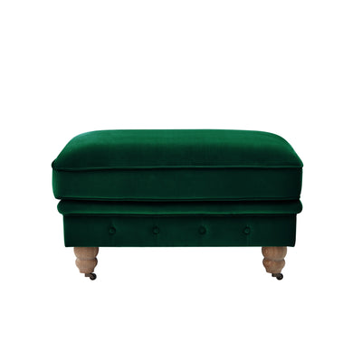 Practicality and fashion mix together with this handy 25" hunter green velvet and natural rolling tufted cocktail ottoman. This chic cocktail ottoman is larger in size and designed to serve as a make-shift coffee table during parties. The surface is wide and flat which is not only suitable for a footrest or seat but also ready to hold trays of appetizers, drinks, or desserts. A natural solid wood frame is finished off with a hunter green upholstery seat that is the epitomy of quality construction and design. Expertly upholstered with padding in a soft solid color velvet, this ottoman is as comfortable as it is good looking. Ottomans are multi-functional additions to your space that add fashion and practical value. 20" H x 25" W x 36" D