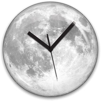 The face is an image mash-up of 65 different actual photographs of the moon. A round domed glass front is a nice detail. The clock face glows for 2 hours after lights are off.