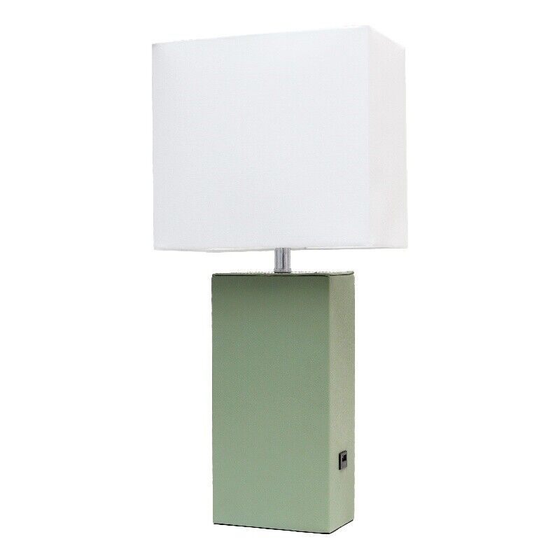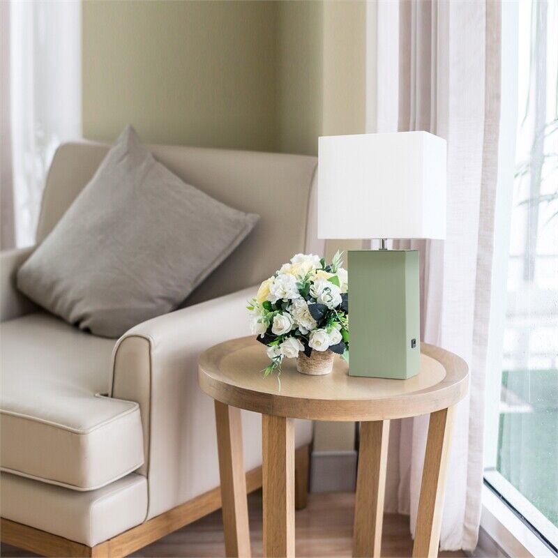 Lalia Home Lexington 21" Leather Base Modern Home Décor Bedside Table Lamp with USB Charging Port for Living Room, Bedroom, Entryway, Foyer, or Office with White Rectangular Fabric Shade, Sage Green