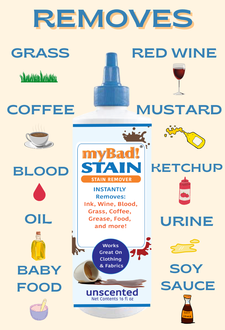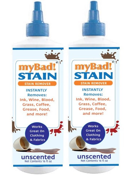 myBad!® Stain Remover 16 oz instantly removes stains caused by ink, wine, blood, grass, coffee, grease, food, and more! The odorless formula is safe to use on clothing, carpet, fabric, tablecloths, and other delicate surfaces.