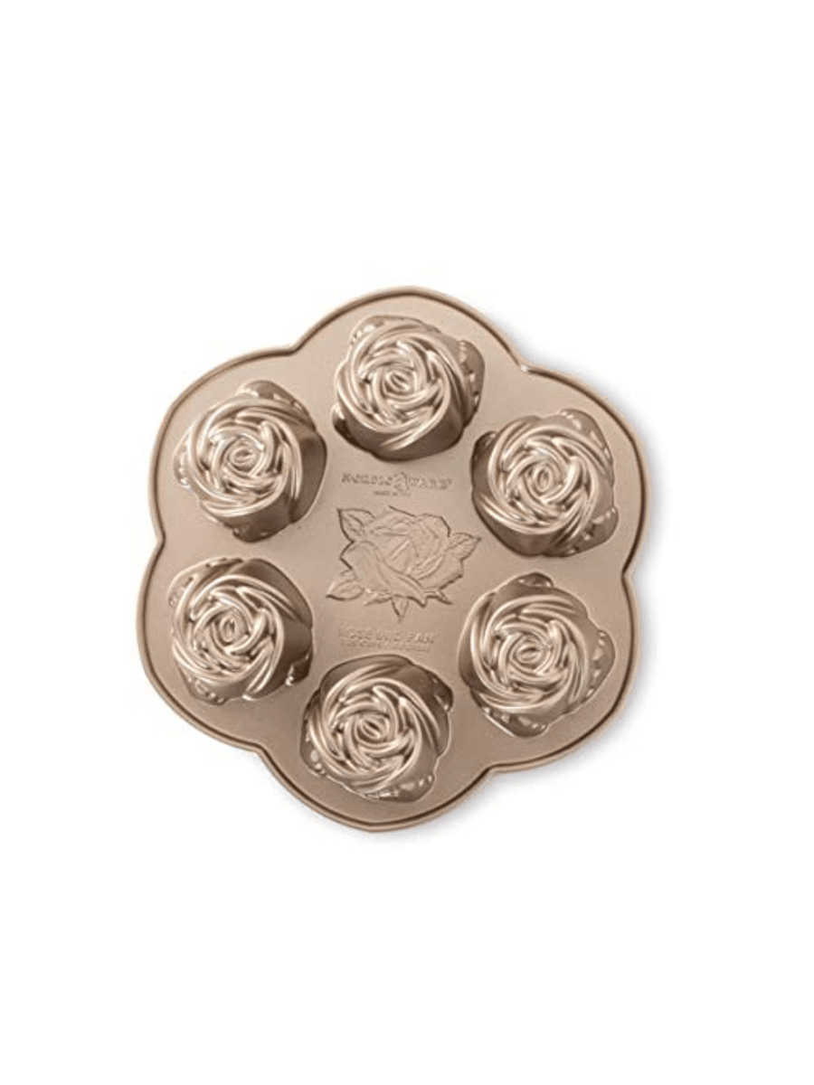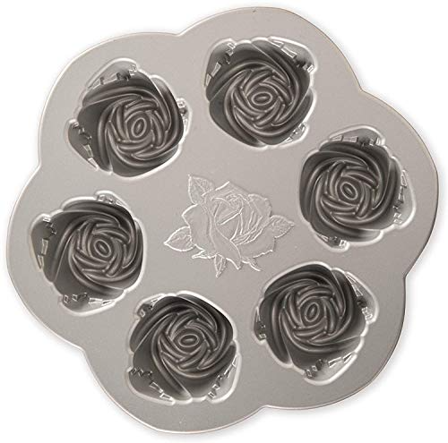Six perfect rosebuds make up this pretty pan. This 2.25 cup capacity cast aluminum baking pan provides fine details and superior baking performance with a nonstick finish. For muffins and cakes, it makes a lovely presentation that can be used year-round. Smaller pan for easy storage. Nonstick interior allows for quick release and easy cleanup.