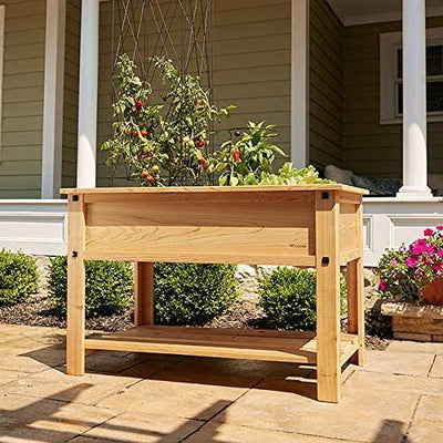 The perfect, natural approach to waist high gardening on your deck, patio or balcony. Deep enough for a healthy tomato root ball to produce a summer's worth of sweet, juicy tomatoes, peppers, lettuces or whatever suits your fancy. Clean, simple Frank Lloyd Wright Mission lines complement any outdoor environment. Includes a fabric liner so no potting soil will leak out and make a mess. The planter box is pre-built so attaching the legs and bottom shelf make for easy assembly. Made of Inland Red Cedar to withstand the elements for years of pleasure.