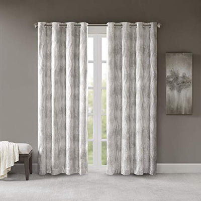 - Keep cool and comfortable with the chic style of the SunSmart Victorio Jacquard Total Blackout Window Panel. This grey total blackout window panel features a soft modern wavy brush stroke design with a luxe sheen and texture for a modern glam look. The knitted jacquard fabric is heavyweight with a 100% blackout finish to block out all outside light, noise, and intrusion ensuring the highest level of privacy. Using this thermal technology the total blackout curtain helps provide maximum energy